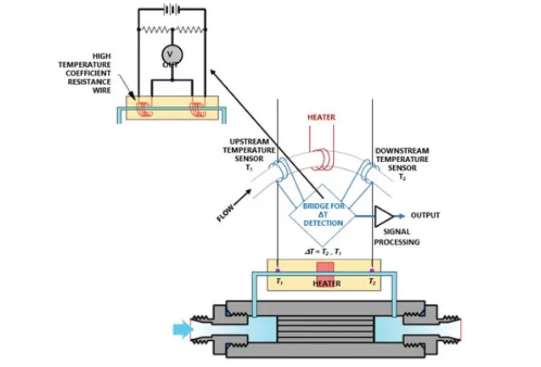 1. 傳感器部分:包含一個加熱元件(如熱絲)和一對溫度檢測元件。加熱元件以恒定功率加熱,當氣體流過加熱元件時,會帶走部分熱量,導致加熱元件周圍溫度下降。這一溫度變化與通過的氣體質量流量成正比。
