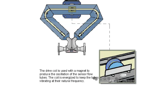 原理是依據(jù)牛頓第二定律,當流體在振動管中流動時,將產(chǎn)生與質(zhì)量流量成正比的科里奧利力。當沒有流體流過時,振動管不產(chǎn)生扭曲,振動管兩側(cè)電磁信號檢測器檢測到的信號是同相位;當有流體經(jīng)過時,振動管在力矩作用下產(chǎn)生扭曲,兩檢測器間將存在相位差。變送器測量左右檢測信號之間的滯后時間,這個時間差乘上流量標定系數(shù)就可確定質(zhì)量流量數(shù)值。而在測量過程中,驅(qū)動線圈會激勵管道以其固有共振頻率相向振動。在管道振動時,每個傳感器上產(chǎn)生的電壓會形成一個正弦波。這可表示一個管相對于另一個管的運動,當兩個正弦波之間的時間滯后,即該數(shù)值與質(zhì)量流量成正比,進而計算出流量數(shù)值。